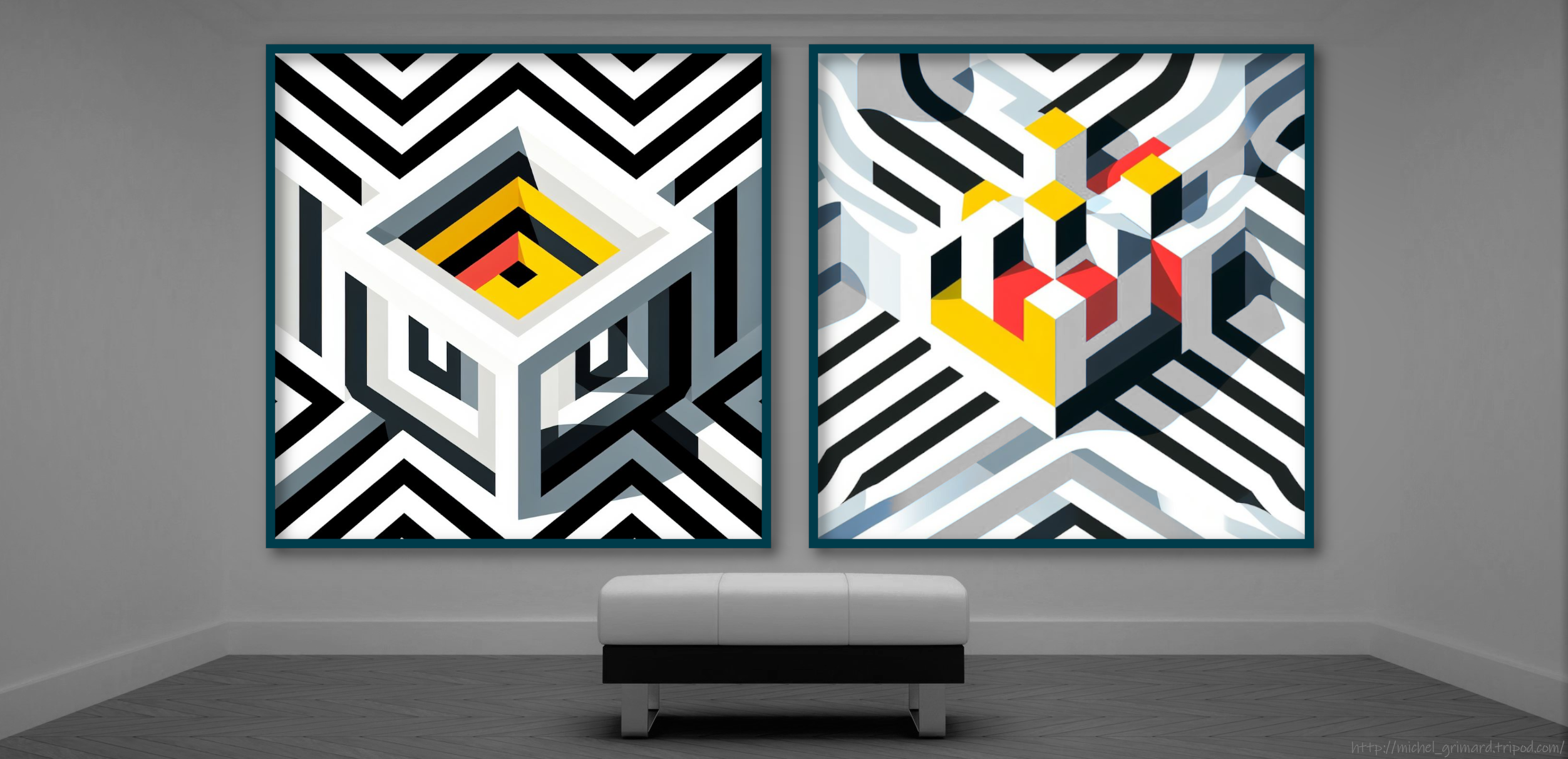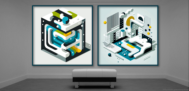 Au tour de Hector Visarely de transposer son code visuel développé sur DALL-E 2 vers DALL-E 3. Ce sera le thème intermédiaire entre deux gros dossiers. La différence à première vue, c'est les tics de programmeurs et leurs créations de fonctions que je reconnais! Je dois maquiller ou mieux m'en éloigner! On flip des mots ou reformule des requêtes, pour trouver la combinaison créative! Du géométrique, c'est du bonbon pour l'IA alors faut aussi faire ses choix avec cette constante dans les compositions. C'est propre comme une salle de chirurgie et souvent chargé!