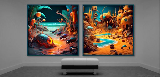 Ce sera du MG par déduction car ça ne matche avec aucuns des artistes virtuels. Encore une fois, je devrai regrouper les tendances et codes visuels proposés par l'IA pendant le développement du seed. J'en ai assez pour partir le thème mais je continue afin de le préciser. Ça débute avec du semblable à la publication des Rivages surréalistes et mes autres variations de plages mais le but est aussi de faire déraper l'IA dans une direction inconnue! La plage B!